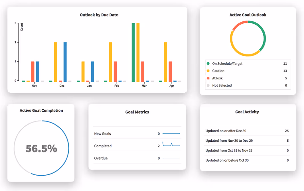 The first step in creating performance goals for employees is identifying your organization’s goals. From there you can set cascading goals for each department, each team within each department, and each individual on each team. This ensures that corporate objectives are always top-of-mind when creating goals at any level of the organization.
