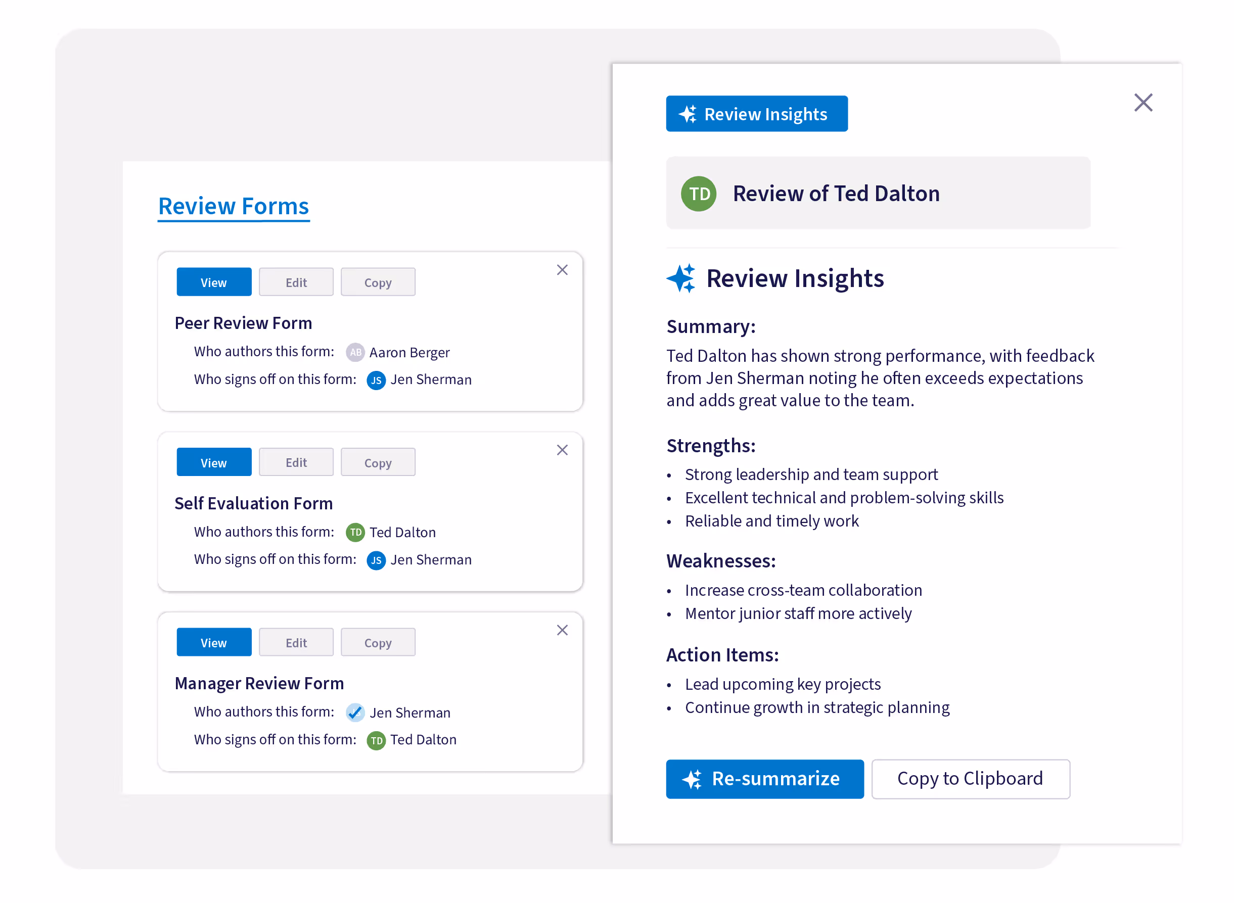 PerformYard's AI Review Summary instantly displays top strengths, opportunities, achievements and quotes from every review form.