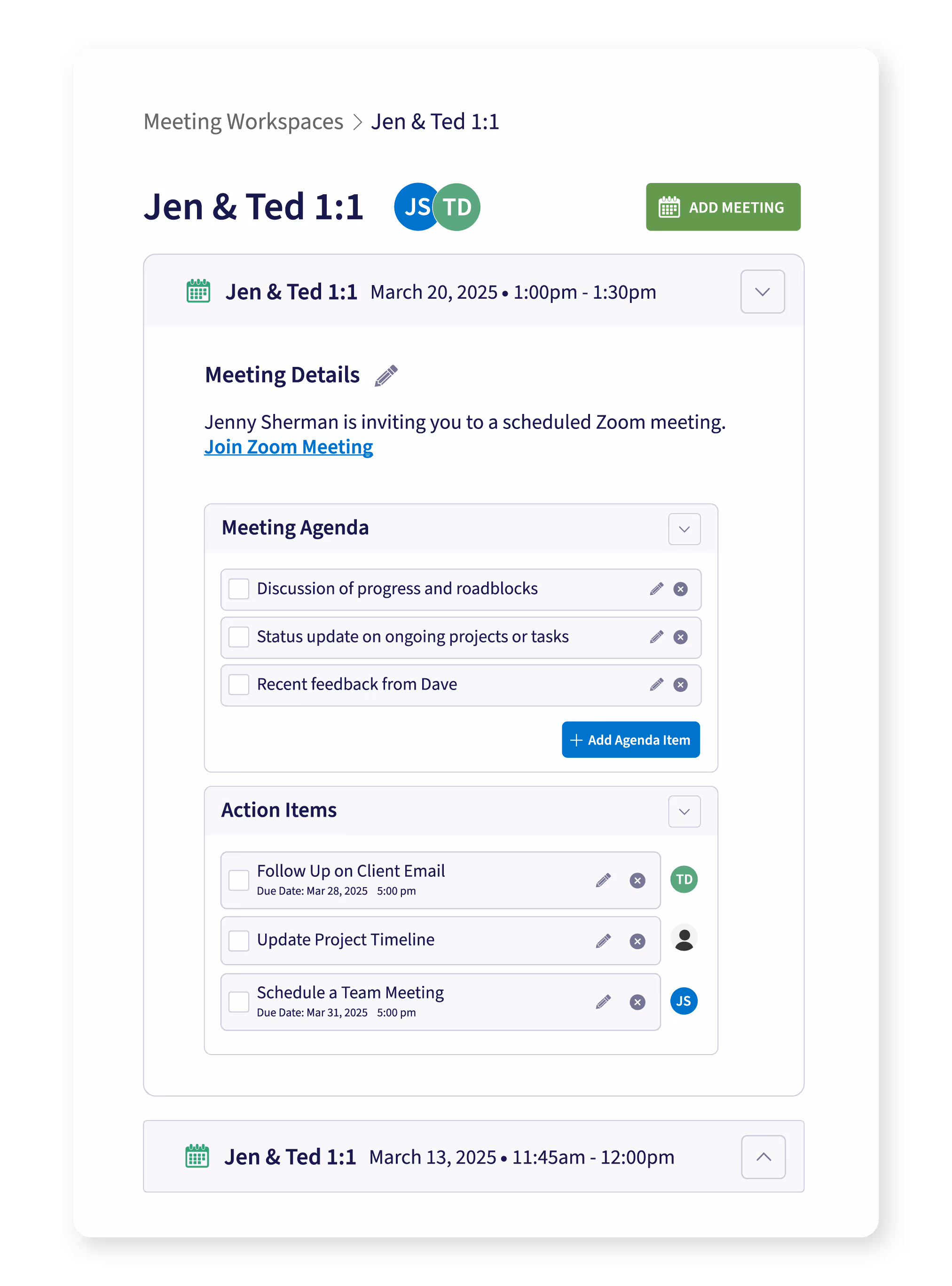 Dedicated meeting management tools excel at ensuring every meeting is prepared and documented. They’re great for internal meetings that occur frequently (so that you can maintain running agendas, carry over unfinished items, and track accountability). They also enhance client meetings by providing a professional structure and record.
