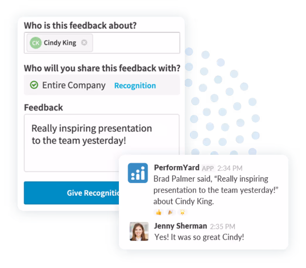 When a team member highlights someone’s contribution (for example, “Who has been especially helpful to you recently?”), use PerformYard to publicly acknowledge that contribution. The platform’s recognition tools let you visibly celebrate great work—reinforcing positive behaviors and boosting overall morale.
