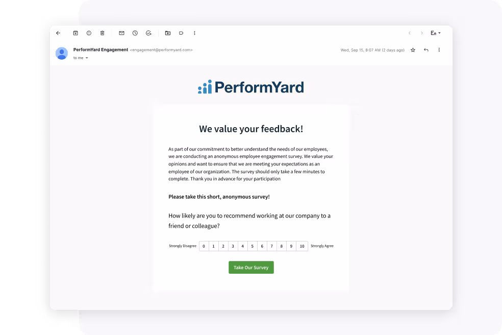 Transform your workplace with PerformYard's comprehensive engagement solution. Our intuitive platform equips you with the tools you need to effectively monitor, analyze, and improve communication and engagement. From extensive surveys to insightful dashboards, we provide the data-driven insights you need to elevate your company culture. Experience how we can revolutionize engagement in your organization today with a personalized demo, and discover why so many professionals trust us for their commications.