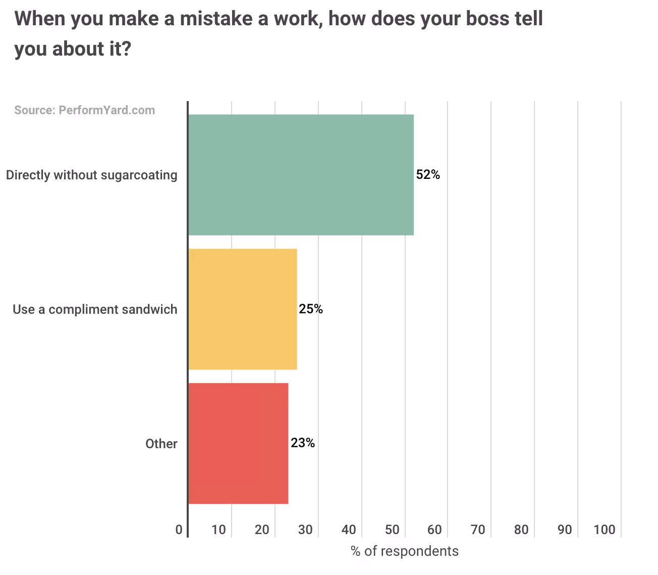 - 52% of people say their bosses do give negative feedback directly, without sugarcoating