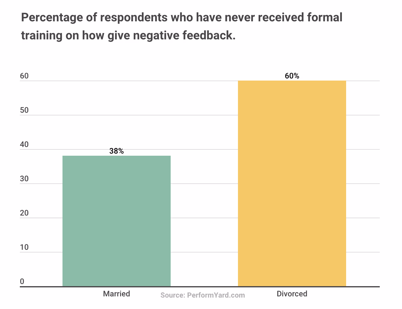 - Among survey respondents who are divorced, 60% have never received formal training on how to give feedback, compared to 40% for the overall population.