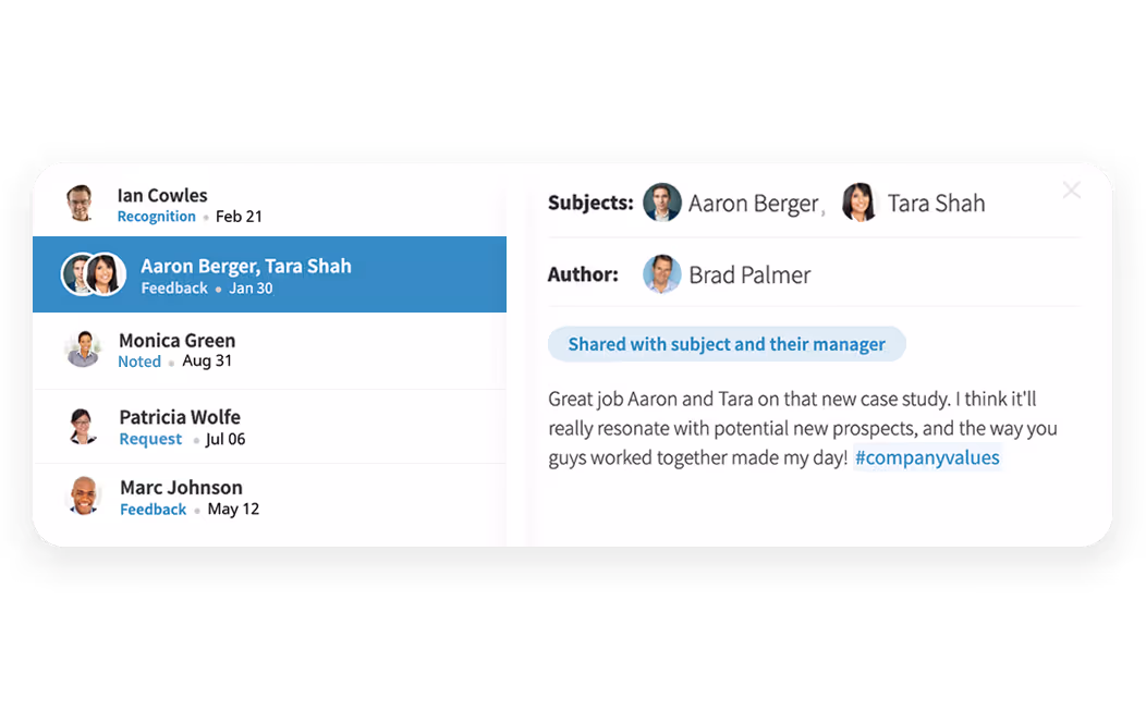 With continuous performance management, you don’t have to wait until an annual review to discuss performance. Instead, frequent, trackable communication takes place throughout the year. Employees and managers discuss goals, correct performance, and discuss challenges in real-time. Everyone knows exactly where they stand. Because performance conversations happen frequently, employees don’t have to wonder if they’re on the right track.