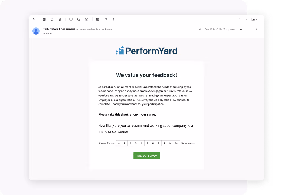 PerformYard automates scheduling, distribution, and reporting — eliminating manual follow-up and disconnected tools. Employees receive surveys directly in their inbox and can complete them in under five minutes with no login required.
